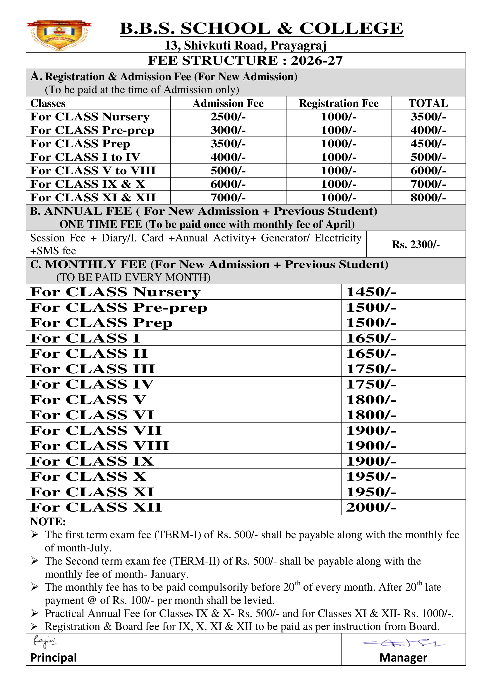 A. Registration & Admission Fee (For New Admission) (To be paid at the time of Admission only)